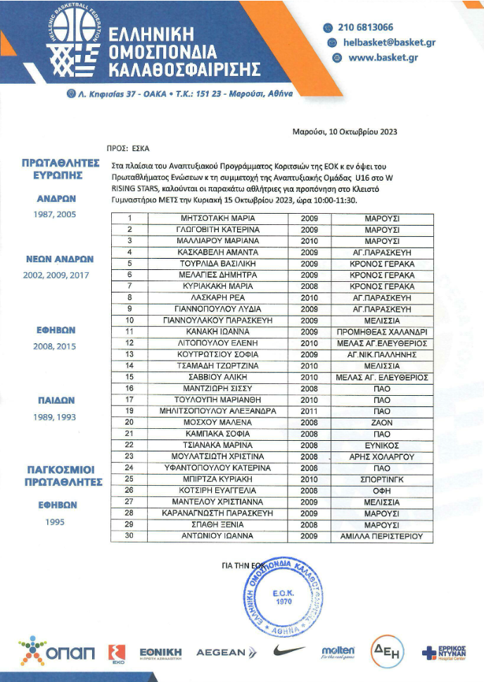 Εν' όψη του Πρωταθλήματος Ενώσεων και τη συμμετοχή της Αναπτυξιακής ομάδας U 16 στο W Rising Stars καλούνται οι παρακάτω Αθλήτριες για προπόνηση .