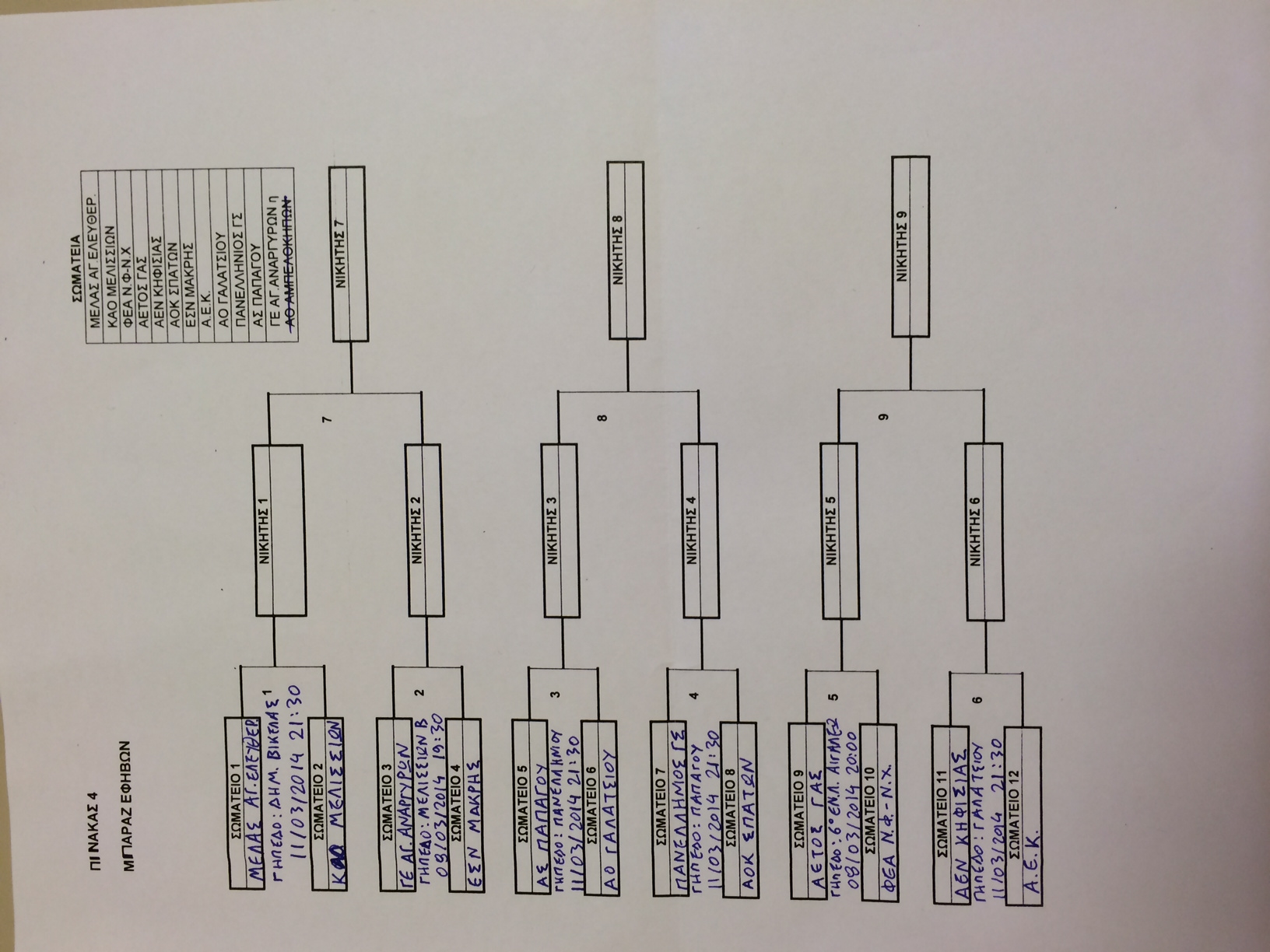 Το χέρι του Προέδρου της Επιτροπής Πρωταθλημάτων Ε.Σ.Κ.Α., κυρίου Κομπορόζου Γιώργου ο οποίος πραγματοποίησε την κλήρωση στα γραφεία της ΕΣΚΑ, έφερε στο δρόμο της Εφηβικής Ομάδας των coach Σιγούνα και coach Βενιού την αντίστοιχη ομάδα του ΚΑΟ ΜΕΛΙΣΣΙΩΝ για το νοκ-αουτ παιχνίδι της Γ ΦΑΣΗΣ που θα πραγματοποιηθεί στο ουδέτερο γήπεδο ΔΗΜ.ΒΙΚΕΛΛΑΣ την Τρίτη 11/03/2014 και ώρα 21:30.