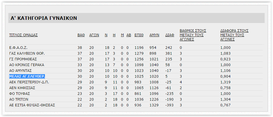 Τελευταία αγωνιστική με αντίπαλο την εκ των διεκδικητών της ανόδου ομάδας του Προμηθέα Χαλανδρίου στην οποία η ομάδα Γυναικών του συλλόγου μας, ΜΕΛΑΣ ο Άγιος Ελευθέριος, ενικήθη με σκορ 61-68.
